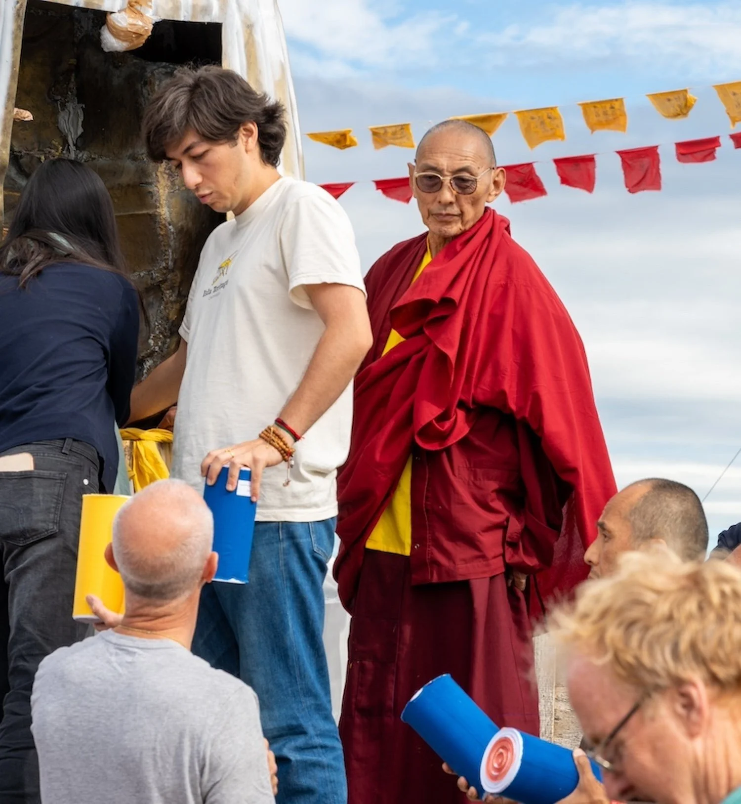 Just a few weeks ago, during his visit in September, Tulku Rigdzin Pema Rinpoche filled the statue with zung (sacred mantra scrolls), which had been carefully prepared by the Lerab Ling community under his guidance. The statue was then sealed and painted and a rabné was auspiciously performed by Kyabjé Shechen Rabjam Rinpoche and Tulku Rigdzin Pema Rinpoche.