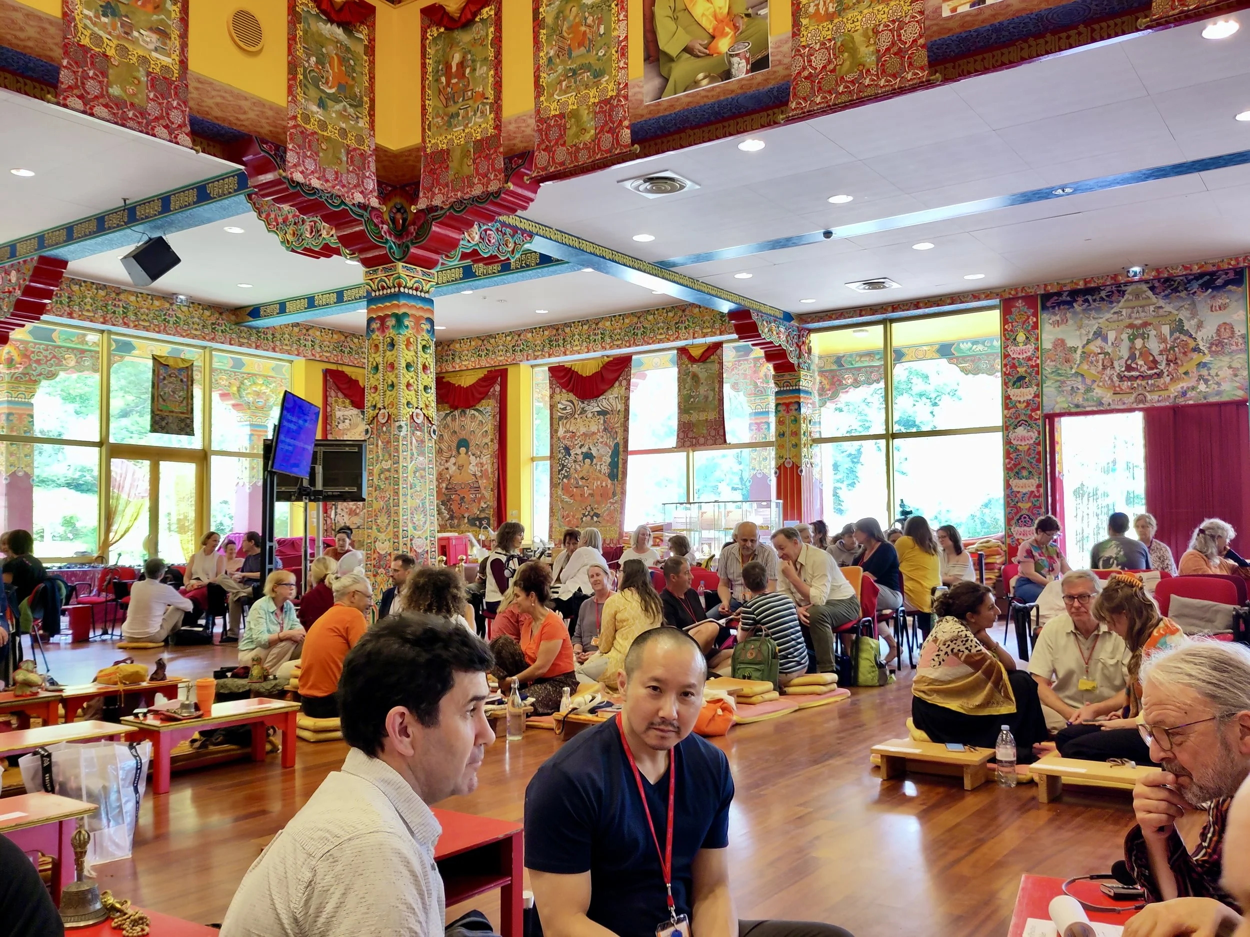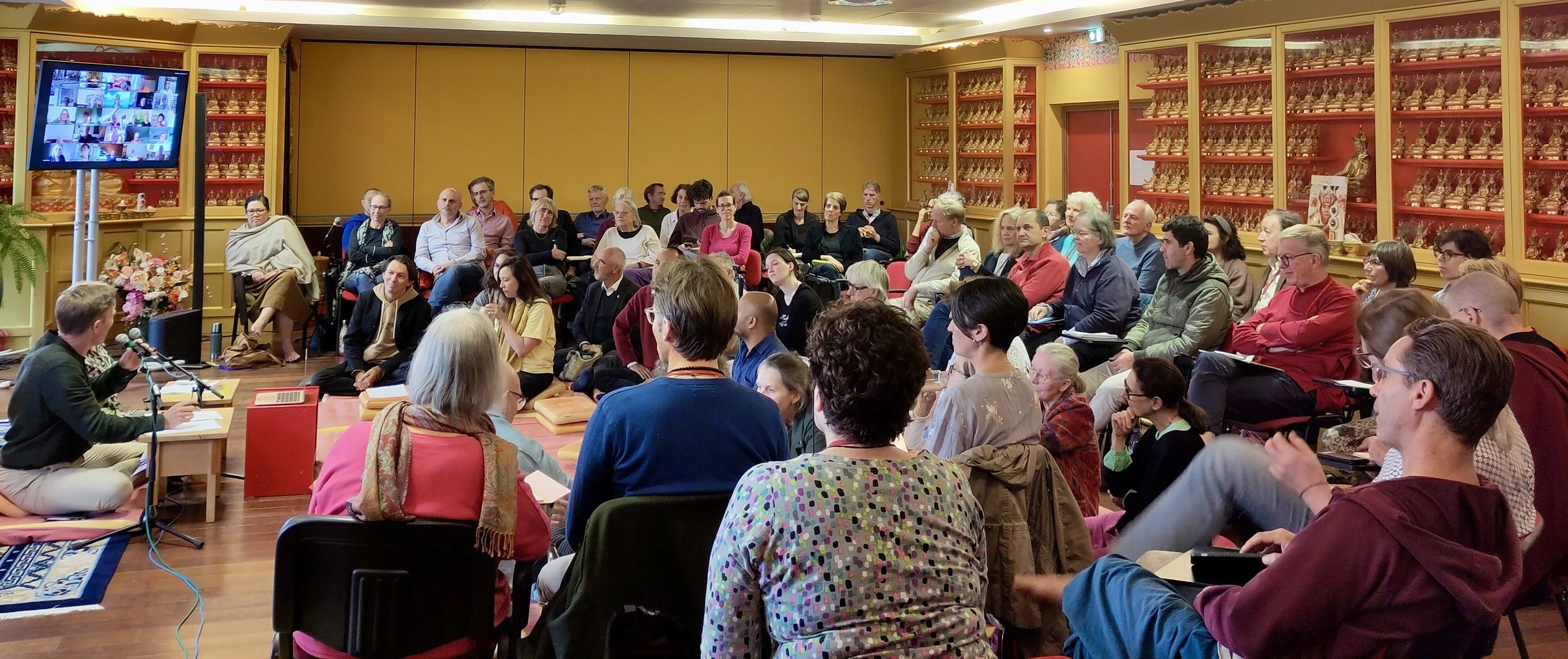 In this spirit, in the second open session with everyone from the Anniversary retreat, we heard participants of different activities led by Rigpa Teachers and Practice Holders, such as the Bodhi and Tibetan Book of Living and Dying courses, share their impressions and appreciations. Afterwards, everyone was invited to reflect and exchange together in small groups, while tea and snacks made their round.
