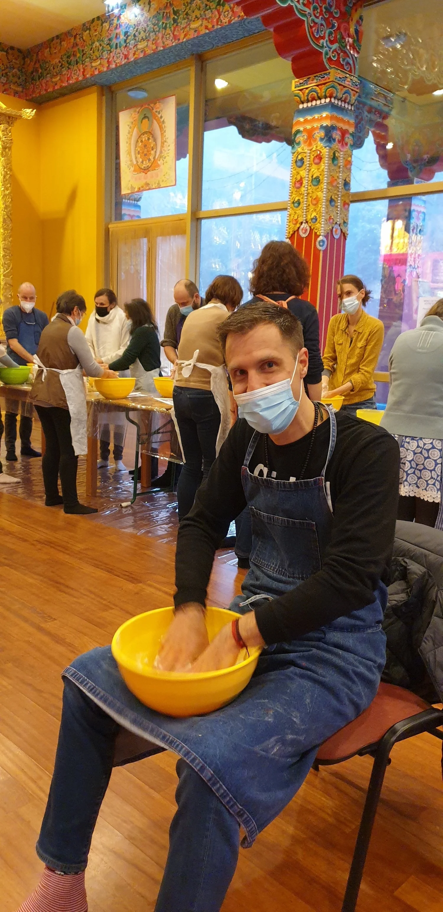 Usando todo tipo de métodos dinámicos para compartir su conocimiento, los formadores respondieron a las necesidades y al nivel de cada aprendiz. Desde la mañana hasta la noche sostuvieron sesiones de formación grupales, prácticas manuales y formación en habilidades, con una guía individual y más - todo mientras participaban en las prácticas de drupchö durante todo el día. Con gran precisión, el umdze Pascal ofreció correcciones detalladas y feedback a los diez aprendices de umdze en sus cantos mediante mensajes de Whastapp en los descansos y Chokyi, la chöpon más experimentada de Rigpa, revisó las fotos de la casa del mandala, las tormas y otros elementos rituales, ofreciendo correcciones específicas y feedback para asegurarse de que todo se hacía con precisión de acuerdo a la tradición.