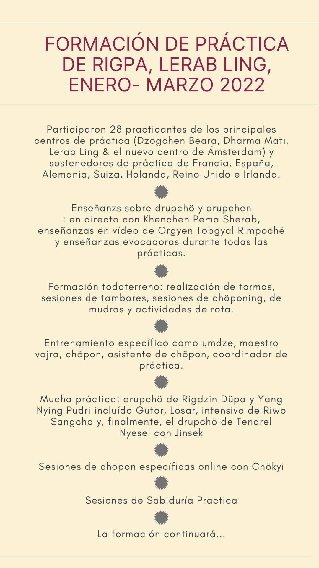 Esta formación comenzó para muchos cuando fueron nominados como sostenedores de práctica en 2019. Desde ese momento, reuniones internacionales periódicas de Zoom comenzaron a reunir al grupo y a explorar su rol. Después, tras ser formalmente presentados a la Sangha en 2021, un grupo piloto participó en un curso online en directo sobre los cuatro primeros "Módulos de Autoaprendizaje sobre Formación Básica de Práctica" (Estos módulos fueron grabados y colgados en Prajna, en Losar, para todos los maestros, sostenedores de práctica y estudiantes que sostienen prácticas online o en los centros). El período de drupchös de Losar, entre enero y marzo del 2022, ofreció la consiguiente oportunidad de formación intensiva, con un estilo de entrenamiento "a pie de campo" en todas las dimensiones de la tradición de práctica que seguimos en Rigpa - choponing, umdze, maestro vajra y coordinación de práctica. El grupo fue explorando diariamente la magnitud de nuestras principales sadhanas en el contexto de práctica del drupchö, compartiendo profundas experiencias en todos los niveles.