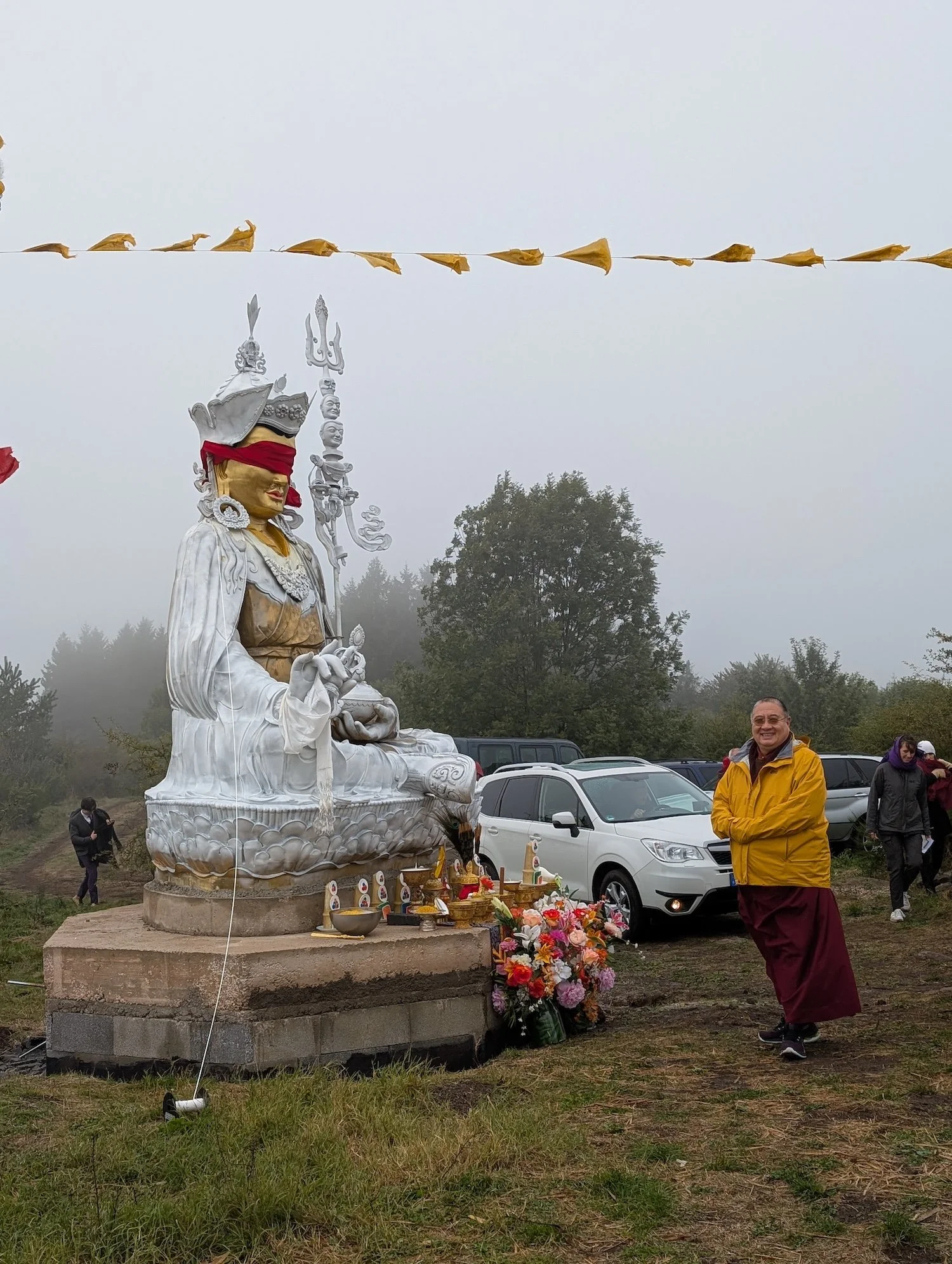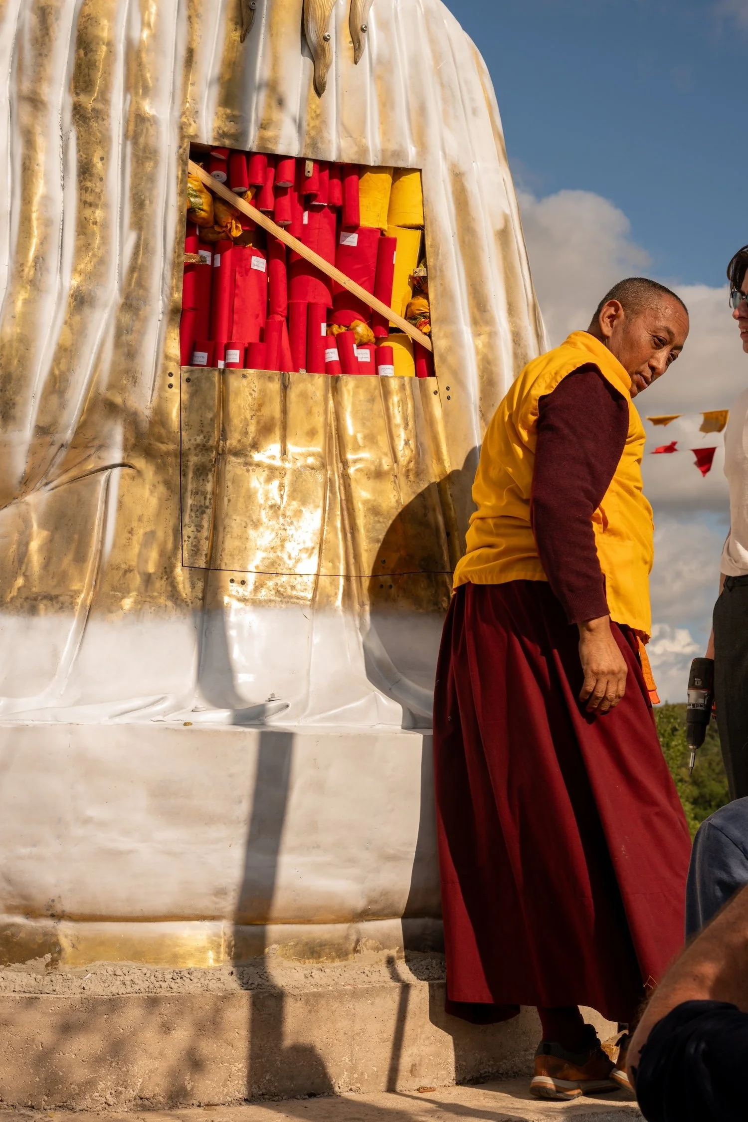 Vor einigen Wochen, während seines Besuchs im September, hat Tulku Rigdzin Pema Rinpoche die Statue mit Zung (heiligen Mantra-Schriftrollen) gefüllt, die von der Lerab Ling Gemeinschaft unter seiner Anleitung sorgfältig vorbereitet wurden. Anschließend wurde die Statue versiegelt und bemalt.