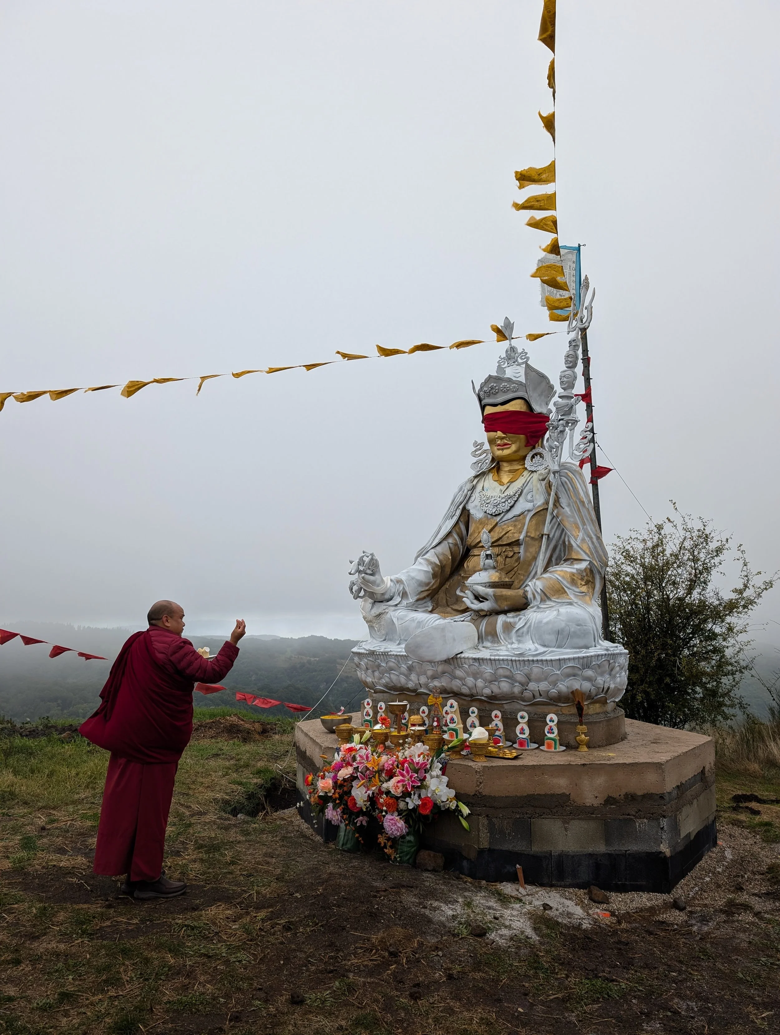 Im Jahr 2022, nach dem Tod von Sogyal Rinpoches Mutter Mayum Tsering Wangmo, hat uns Khenchen Namdrol Rinpoche geraten, eine Guru-Rinpoche-Statue auf dem Hügel in Lerab Ling zu errichten. Er hat uns empfohlen, diese Statue so aufzustellen, dass ihr Blick auf den Tempel gerichtet ist, und mit der Intention, alle Wünsche von Mayum-la zu erfüllen, Lerab Ling zu fördern und Verdienst anzusammeln.